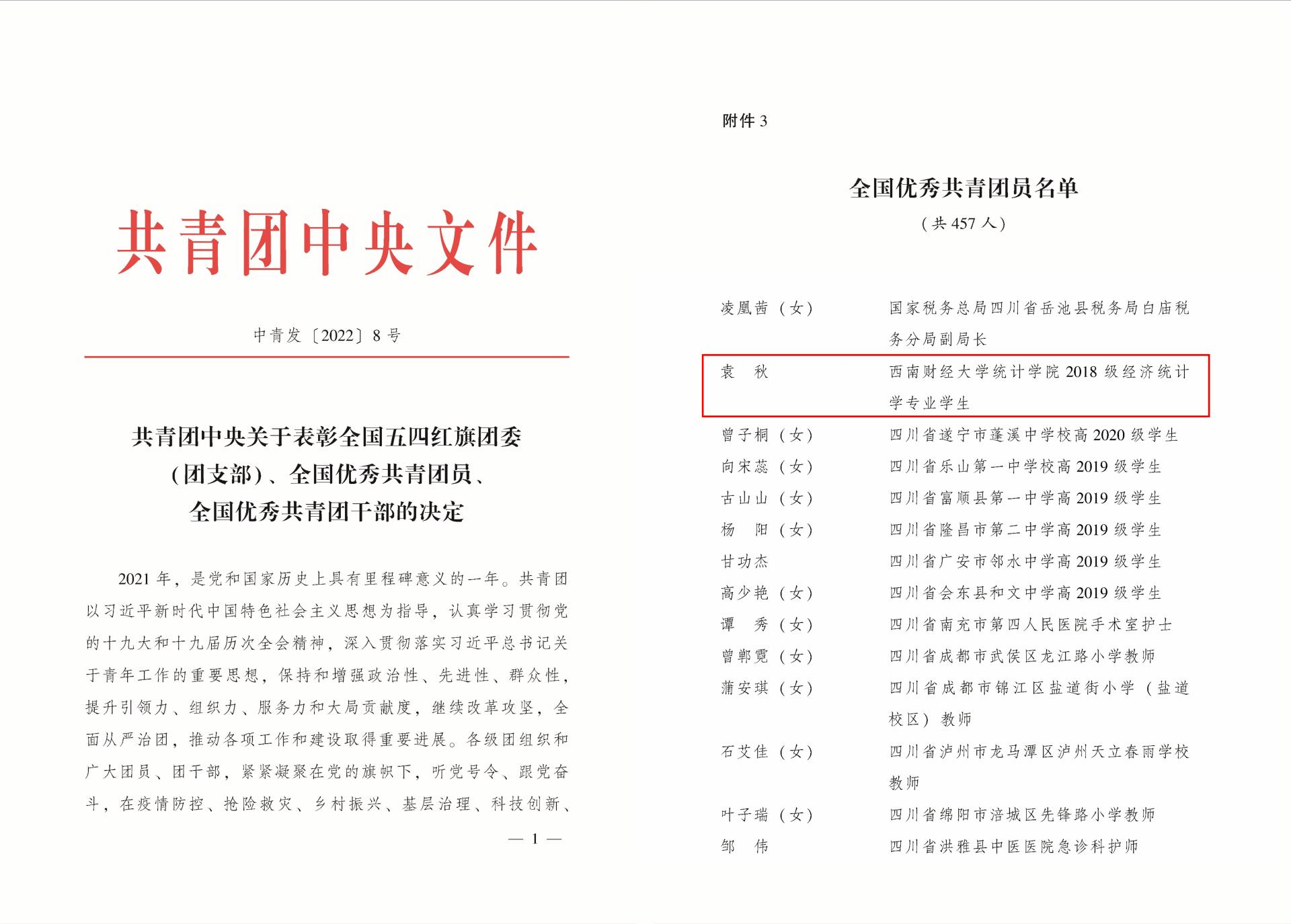 五四前夕,共青團中央印發(fā)關(guān)于表彰全國五四紅旗團委(團支部)、全國優(yōu)秀共青團員、全國優(yōu)秀共青團干部的決定,共青團四川省委、四川省青年聯(lián)合會印發(fā)關(guān)于表彰第25屆“四川青年五四獎?wù)隆钡臎Q定,共青團四川省委印發(fā)關(guān)于表彰省五四紅旗團委(團支部)、省優(yōu)秀共青團員、省優(yōu)秀共青團干部的決定,我校統(tǒng)計學(xué)院2018級經(jīng)濟統(tǒng)計專業(yè)袁秋同學(xué)榮獲“全國優(yōu)秀共青團員”,中國金融研究中心教師文書洋被授予第25屆“四川青年五四獎?wù)隆保ど坦芾韺W(xué)院團委榮獲“四川省五四紅旗團委”。