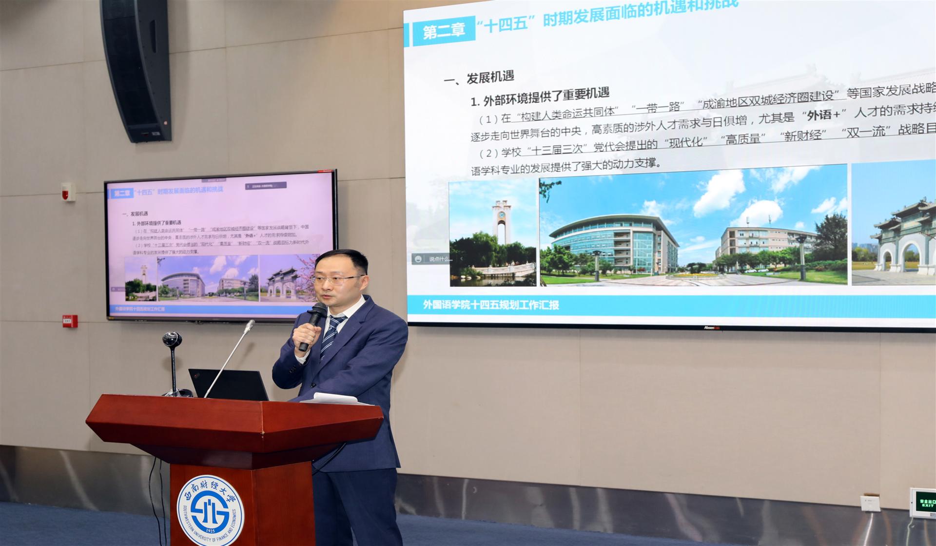 張家瑞做“學(xué)院十四五規(guī)劃”專題匯報(bào),回顧了學(xué)院“十三五”時(shí)期取得的階段性成果,分析了“十四五”時(shí)期學(xué)院發(fā)展面臨的機(jī)遇和挑戰(zhàn)。學(xué)科建設(shè)咨詢委員會(huì)主席、四川外國(guó)語(yǔ)大學(xué)校長(zhǎng)董洪川發(fā)言,希望加強(qiáng)交流,互學(xué)互鑒,共同推動(dòng)學(xué)科專業(yè)建設(shè)。其他委員表示,將為學(xué)院“一流學(xué)科”“一流專業(yè)”建設(shè)出謀劃策,提升學(xué)院學(xué)科專業(yè)建設(shè)水平。