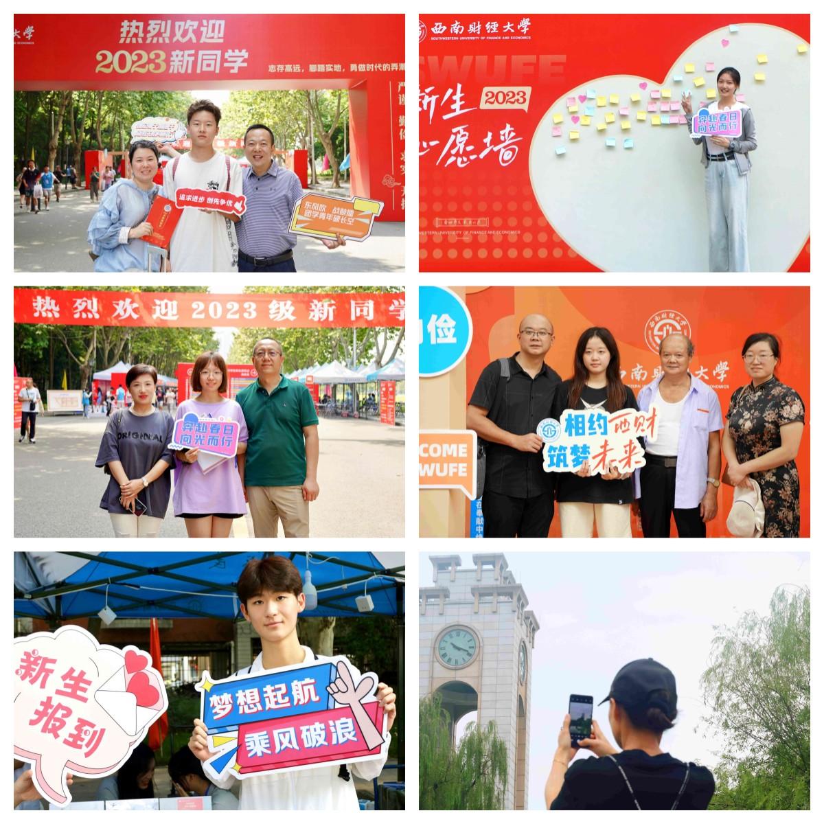在濟民廣場、在光華大學門、在鐘樓、在《青春》雕塑、在各報到點位……讓人流連的校園風景、精心設計的心愿墻和特色相框,引得新生和家長紛紛駐足打卡,留下2023級西財人的“獨家記憶”。
