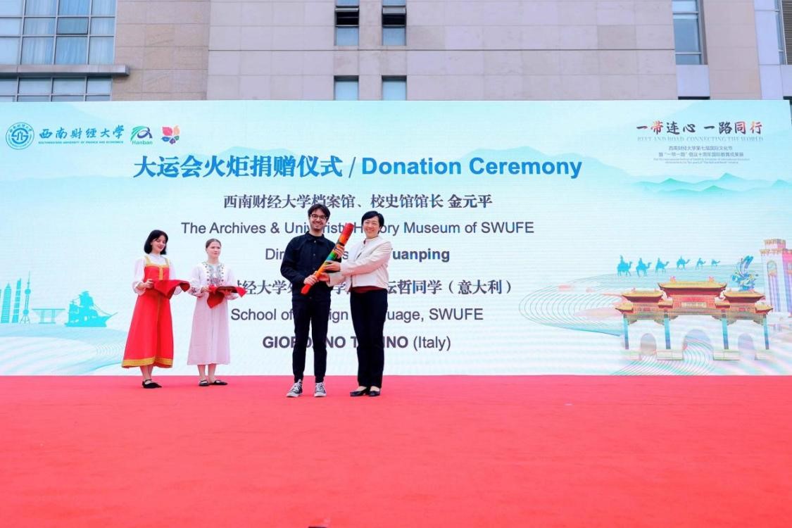 成都第31屆世界大學(xué)生運(yùn)動(dòng)會(huì)開(kāi)幕式主火炬手、意大利留學(xué)生蘇耘哲借此次國(guó)際文化節(jié)契機(jī),將自己的點(diǎn)火火炬捐贈(zèng)給學(xué)校檔案館。蘇耘哲同學(xué)希望這支象征和平和友誼的火炬能夠激勵(lì)更多學(xué)子追求夢(mèng)想,不斷挑戰(zhàn)自我。檔案館金元平館長(zhǎng)接受捐贈(zèng)并向蘇耘哲同學(xué)頒發(fā)了捐贈(zèng)證書(shū)。