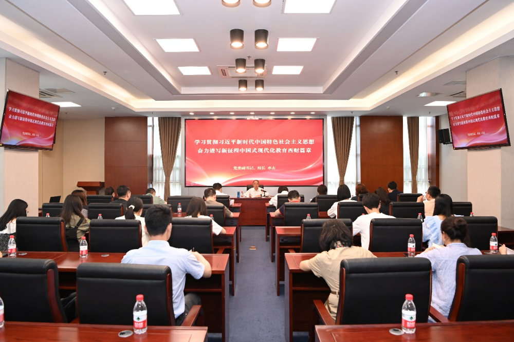 卓志以《學(xué)習(xí)貫徹習(xí)近平新時代中國特色社會主義思想,奮力譜寫新征程中國式現(xiàn)代化教育西財篇章》為主題,聚焦深入學(xué)習(xí)貫徹習(xí)近平總書記關(guān)于教育的重要論述講授了黨課。他強調(diào),要深刻理解建設(shè)中國特色社會主義教育強國的價值內(nèi)涵,牢牢把握建設(shè)中國特色社會主義教育強國的前進方向,牢記為黨育人、為國育才的初心使命,積極投身實踐,為加快建設(shè)教育強國、科技強國、人才強國貢獻西財力量。
