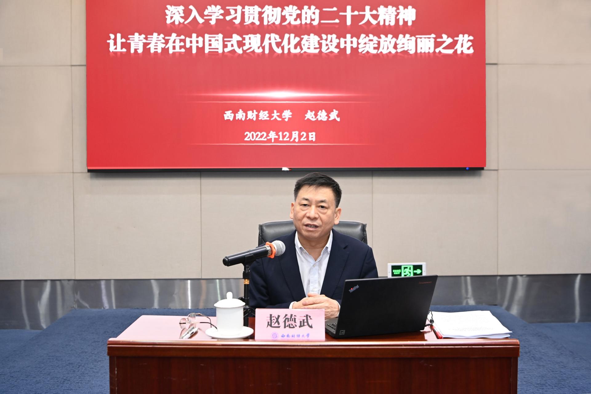 趙德武要求,學習宣傳黨的二十大精神,青年學生是重要群體,學生骨干應該走在前列、做出示范。要堅定理想信念,堅定不移聽黨話跟黨走,把握好習近平新時代中國特色社會主義思想的世界觀和方法論,堅持好、運用好貫穿其中的立場觀點方法,用理想之光照亮奮斗之路,用信仰之力開創美好未來,自覺做習近平新時代中國特色社會主義思想的堅定信仰者、積極傳播者、忠實踐行者。要練就過硬本領,腳踏實地強本領增才干,珍惜大學時光,珍惜美好韶華,將學習知識與增長見識相結合,在理論學習、學術研究、創新創業、社會實踐、志愿服務等各個領域中去求真學問、練真本領,努力練就堪當民族復興重任的“寬肩膀”和“硬本領”。要勇于團結奮斗,肩扛重任敢擔當善作為,在拼搏中砥礪奮斗、在奮斗中團結向上,自覺融入人民群眾團結奮斗的歷史洪流,以青春之我、奮斗之我,為百年西財添磚加瓦,為民族復興鋪路架橋,為全面建設社會主義現代化國家貢獻青春力量。