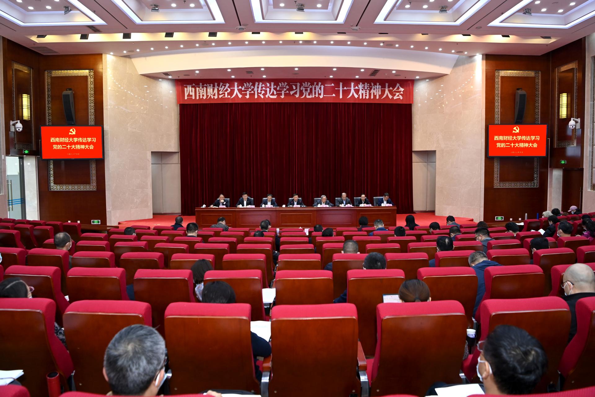10月28日,學(xué)校召開傳達(dá)學(xué)習(xí)黨的二十大精神大會。黨委書記趙德武傳達(dá)黨的二十大精神,對學(xué)校學(xué)習(xí)宣傳貫徹黨的二十大精神工作作出全面安排部署,強(qiáng)調(diào)深入學(xué)習(xí)宣傳貫徹黨的二十大精神是當(dāng)前和今后一個時期全校的首要政治任務(wù),全校師生員工要深刻領(lǐng)悟“兩個確立”的決定性意義,切實增強(qiáng)“四個意識”、堅定“四個自信”、做到“兩個維護(hù)”,自覺把思想統(tǒng)一到黨的二十大精神上來,把力量凝聚到實現(xiàn)黨的二十大確定的各項任務(wù)上來,牢記空談?wù)`國、實干興邦,堅定信心、同心同德,踔厲奮發(fā)、勇毅前行,埋頭苦干,堅定推動黨的二十大決策部署在學(xué)校落地落實、見行見效,為辦好人民滿意的高等財經(jīng)教育、加快建設(shè)高等教育強(qiáng)國、譜寫全面建設(shè)社會主義現(xiàn)代化國家新篇章貢獻(xiàn)西財力量。