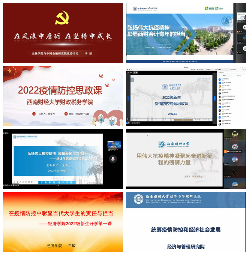 9月5日,西南財經大學8600余名學生和200余名老師相約云端,在線教學全面開啟。當天,全校2022級7600余名新生通過在線方式,聆聽學院書記、院長講授疫情防控思政第一課,感悟偉大抗疫精神,砥礪西財青年品格,學生反響熱烈。