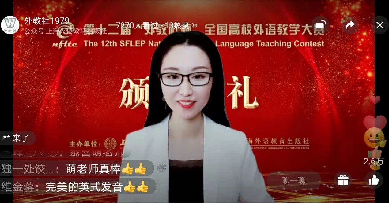 9月23日至25日,第十二屆“外教社杯”全國高校外語教學大賽(外語類專業組)全國總決賽成功舉辦。我校外國語學院潘紫萌老師榮獲商務英語專業組全國特等獎。