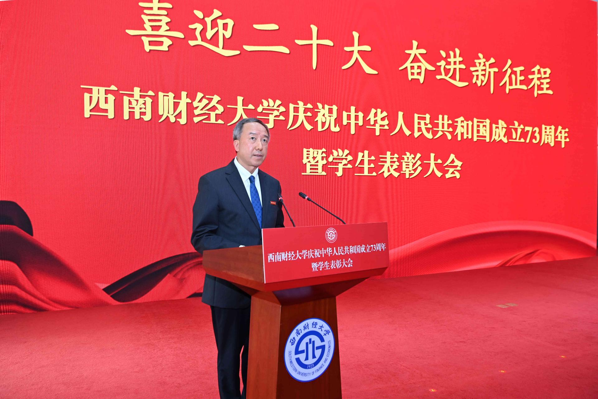趙德武代表學校黨委和行政,向全校師生員工致以節日的問候,向受到表彰的先進集體和優秀個人表示熱烈的祝賀,深情寄語西財青年“喜迎二十大、永遠跟黨走、奮進新征程,努力成長為堪當民族復興重任的時代新人”。