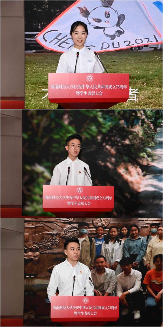 受表彰的三好學生代表宓雪兒、優秀學生干部代表崔燦、先進班集體班長代表劉翰林結合自身學習生活經歷進行先進事跡分享交流,號召廣大西財學子傳承弘揚“經世濟民、孜孜以求”西財精神,找準人生定位、錨定人生航向,立足新時代新征程,堅定不移聽黨話、跟黨走,努力成長為堪當民族復興大任的時代新人。
