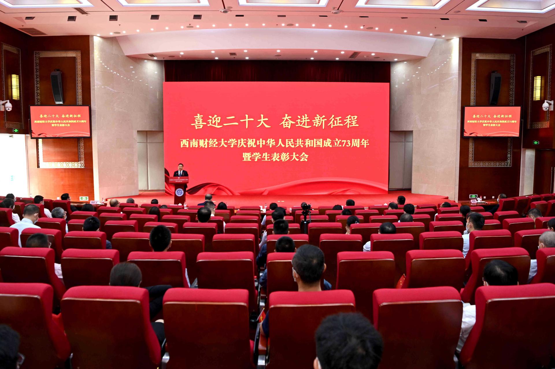 9月30日下午,學校隆重慶祝中華人民共和國成立73周年,表彰一批學生先進集體和優秀個人。黨委書記趙德武,黨委副書記、校長卓志,黨委副書記馬驍,黨委副書記、副校長李永強,黨委常委、副校長尹慶雙、史代敏、張邦富、李志生,各職能教輔部門和學院(研究院)主要負責人及學生代表參加大會。卓志主持會議。