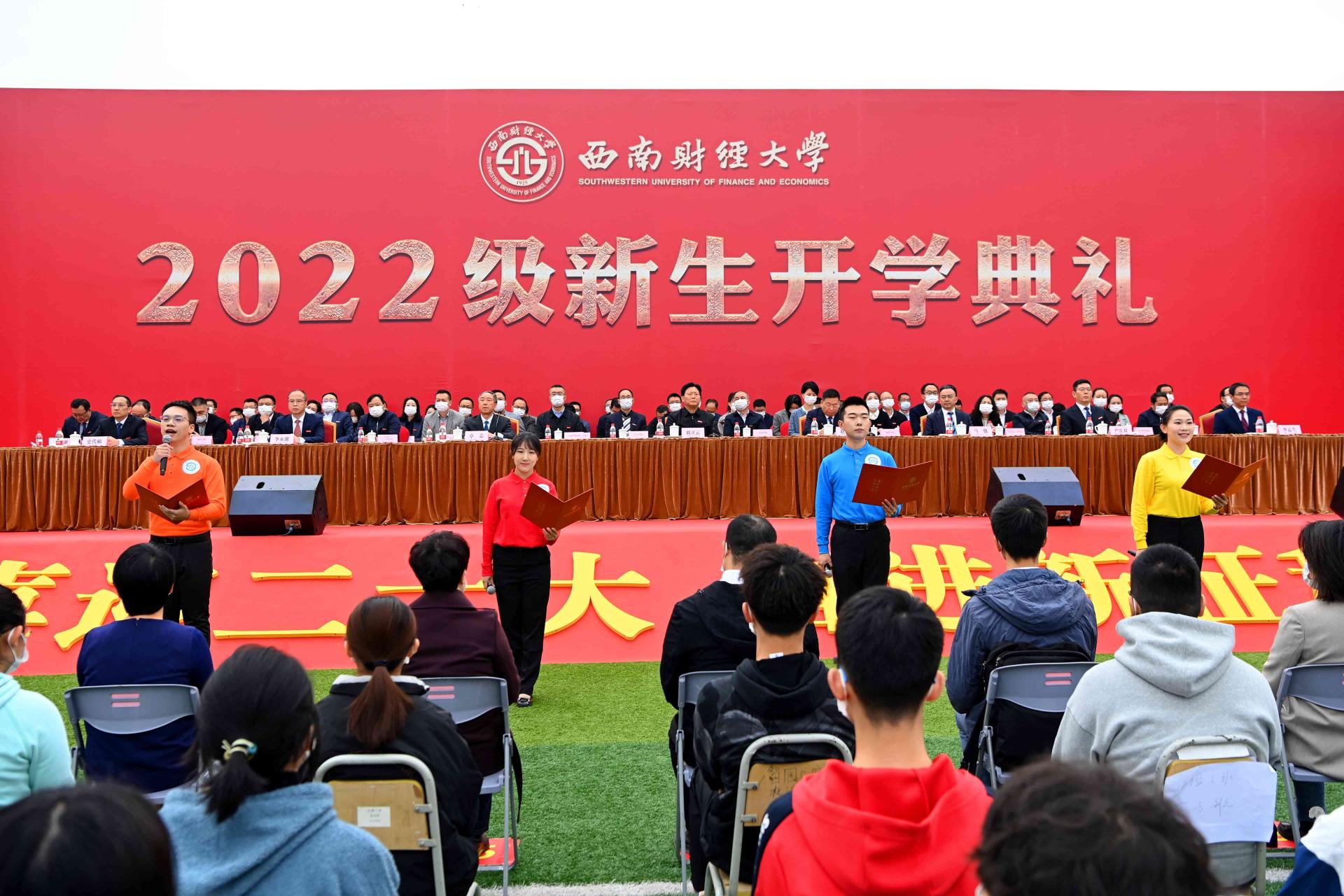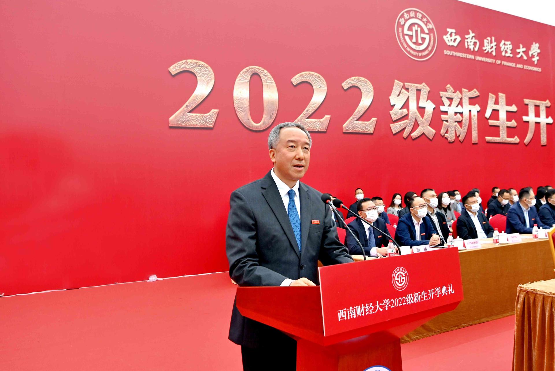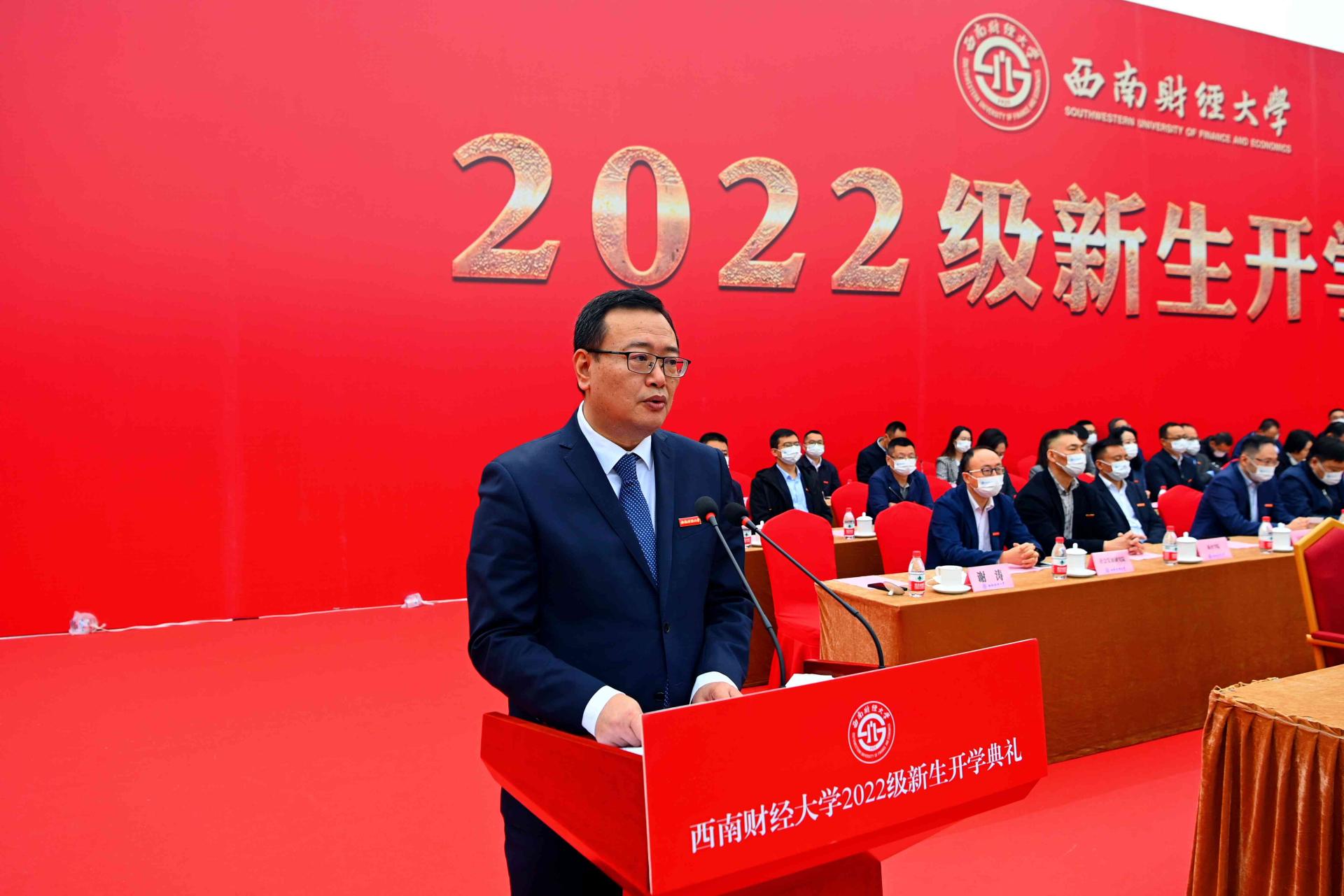 趙德武在主持典禮時深情回顧了西南財經大學97年走過的教育報國之路、團結奮進之路、追求卓越之路。他強調,黨的二十大召開在即,新時代西財人作為強國一代,生逢盛世、重任在肩,要堅定不移聽黨話、跟黨走,將個人理想追求與中華民族偉大復興緊緊相連,不負韶華、不負時代、不負人民,永葆青春理想,傳承西財精神,在青春的賽道上跑出當代青年的最好成績。他寄語全體新同學,要堅定理想信念,高擎信仰之炬,牢固樹立共產主義遠大理想和中國特色社會主義共同理想,自覺在學懂弄通習近平新時代中國特色社會主義思想上下功夫,自覺做“兩個確立”的堅決擁護者和“兩個維護”的堅定踐行者。要勤學善思篤行,勇攀知識之巔,以做大學問、做真學問為志向,持之以恒鉆研世界學術前沿和國家發展需求的真問題,在破解“卡脖子”問題上下苦功、練真功,把個人的“小我”融入到實現“國家富強,民族復興,人民幸福”的“大我”之中,創造無愧于時代和人民的業績。要勇于拼搏創新,點亮奮斗之光,在學習生活中奮勇爭先,在急難險重任務中沖鋒在前,在基層一線經受磨礪,在真刀真槍的鍛造中攻堅克難、磨礪意志、堅定信念,用行動擦亮奮斗這個青春最亮麗的底色。要傳承西財精神,共襄百年之業,用心感悟“百年西財”的歷史傳統、精神文化、名師大家和奮進力量,與學校共奮進、同成長,在回望百年輝煌、傳承西財精神中凝聚走向未來的力量。趙德武祝愿新同學們在新時代新征程中,大氣為人、大智謀事、大愛行天下,充分釋放最富挑戰性的創造力,以最好的青春、最美的奮斗,闊步邁向屬于每一個西財人的理想彼岸和廣闊未來。