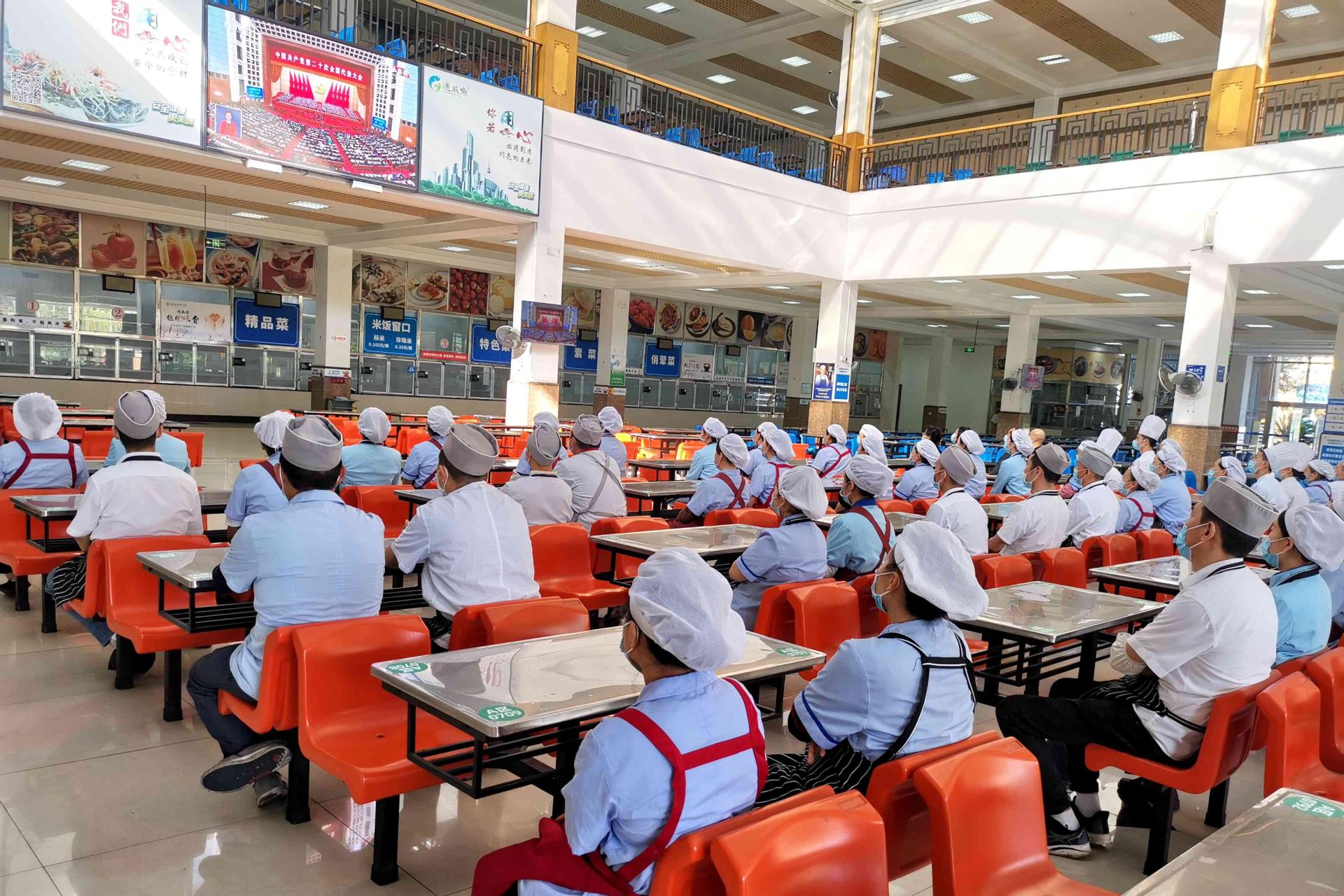 校園內(nèi)排列整齊的五星紅旗迎風招展,鮮艷橫幅與藍天綠樹映照成畫。“熱烈慶祝中國共產(chǎn)黨第二十次全國代表大會勝利召開”和“高舉中國特色社會主義偉大旗幟,奮力譜寫全面建設社會主義現(xiàn)代化國家嶄新篇章”橫幅在主會場內(nèi)高高懸掛,黨員徽章在黨員干部師生胸前熠熠生輝。