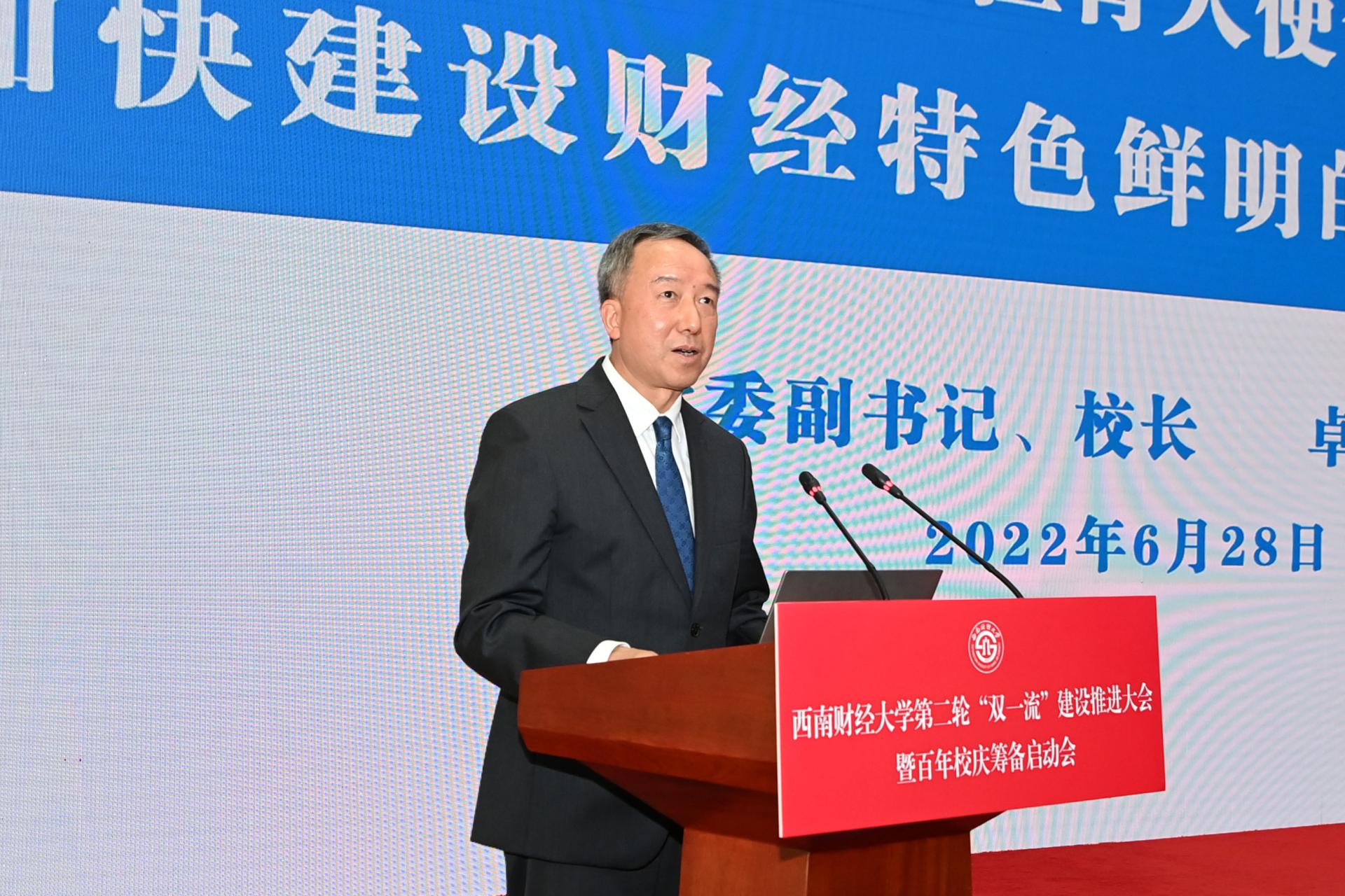 陳朝先在致辭中表示,“雙一流”建設是黨和國家賦予高等教育的重要使命,省委省政府高度重視發(fā)展高等教育,自“雙一流”建設啟動以來,始終堅持以高度政治自覺,從戰(zhàn)略高度扎實推進。西南財大等川內“雙一流”建設高校全力拼搏、奮力貢獻,取得了矚目成績。他指出,擁有97年辦學歷史的西南財大是國家高等教育事業(yè)弘篇中的精彩一頁,希望學校在第二輪“雙一流”建設中彰顯優(yōu)勢特色,搶抓時代機遇,服務國之大者,在“跳出教育看教育、跳出現(xiàn)狀找差距、跳出四川找標桿”過程中,聚焦打好“金融、西部、科技、國際”四張牌,充分發(fā)揮西財在經(jīng)濟、管理等方面的優(yōu)勢,主動對接、主動服務國家區(qū)域重大戰(zhàn)略需求,在成渝地區(qū)雙城經(jīng)濟圈建設、“西數(shù)東算”戰(zhàn)略布局、西部金融中心建設中找準結合點,聚焦鄉(xiāng)村振興、共同富裕、數(shù)字經(jīng)濟、碳達峰碳中和等領域攻堅克難、主動服務,努力培養(yǎng)國家急需的卓越財經(jīng)人才和新時代治蜀興川人才,為全面建設社會主義現(xiàn)代化國家、推動新時代治蜀興川再上新臺階作出更大貢獻。