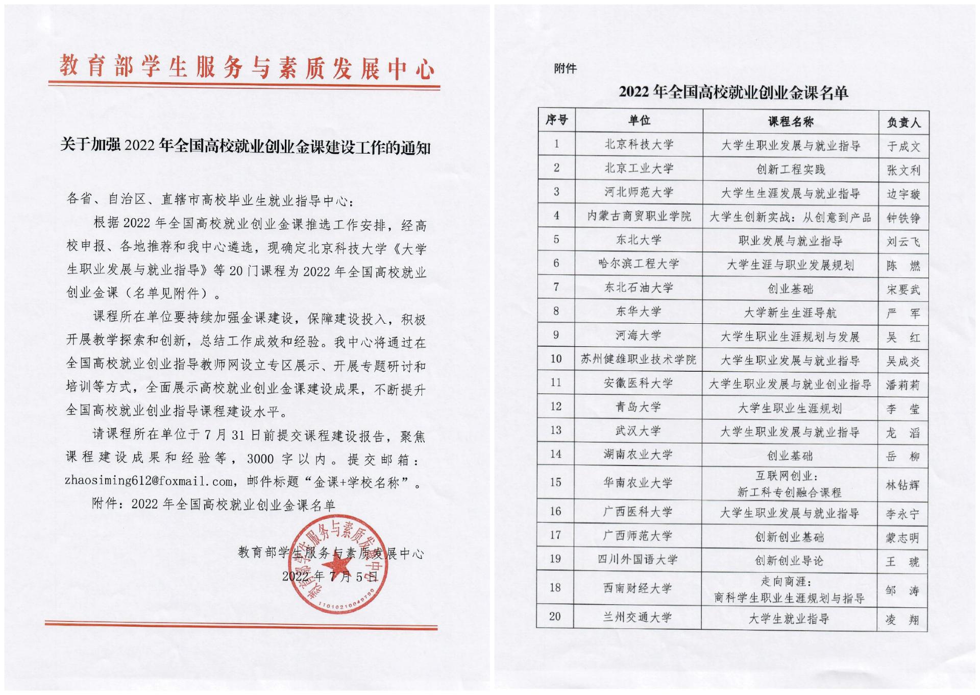 近日,教育部學(xué)生服務(wù)與素質(zhì)發(fā)展中心下發(fā)《關(guān)于加強(qiáng)2022年全國(guó)高校就業(yè)創(chuàng)業(yè)金課建設(shè)工作的通知》,我校《走向商涯:商科學(xué)生職業(yè)生涯規(guī)劃與指導(dǎo)》課程被評(píng)為2022年全國(guó)高校就業(yè)創(chuàng)業(yè)金課。本次評(píng)選全國(guó)共20門課程入選,我校是四川省唯一獲評(píng)高校。