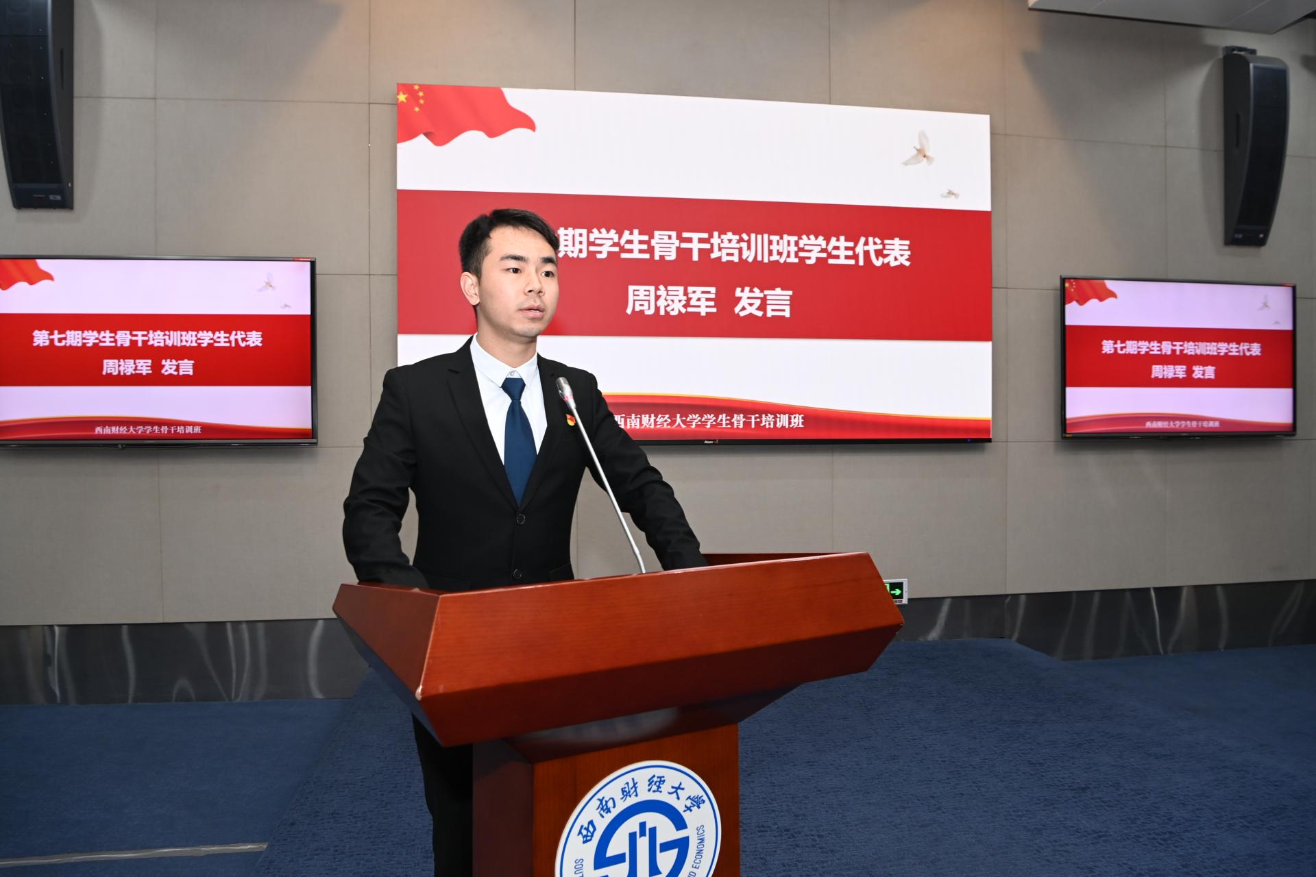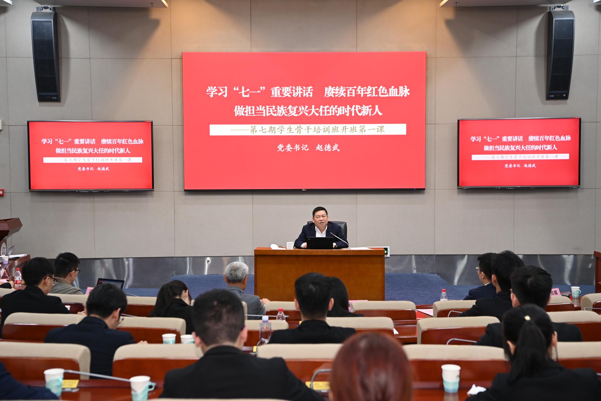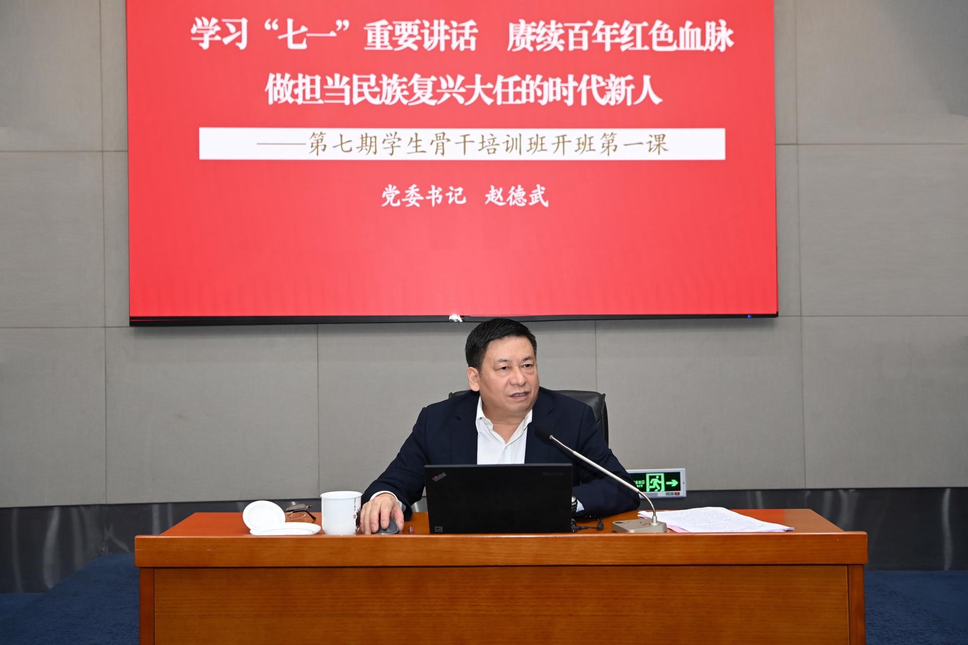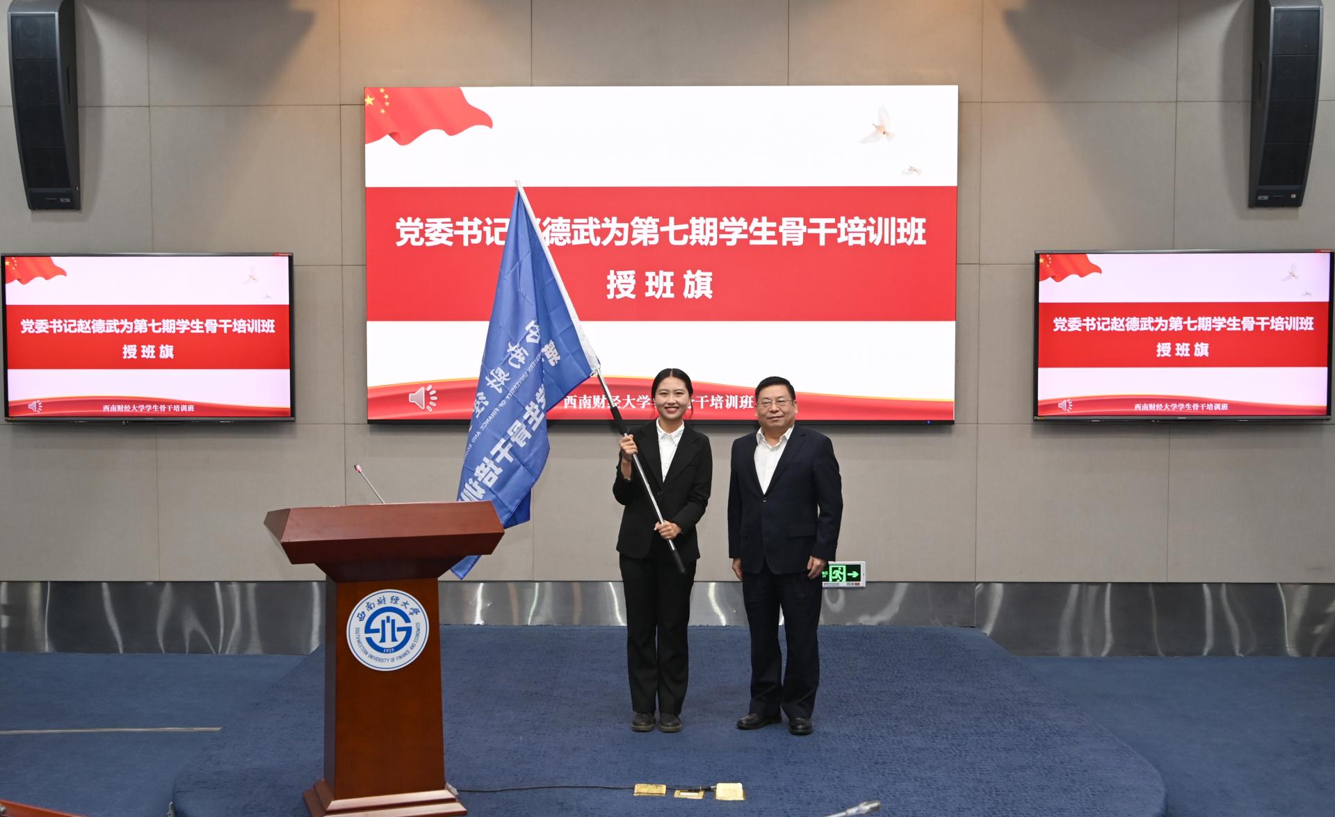 儀式上,趙德武為第七期學生骨干培訓班授旗,寄語第七期學員要堅定理想信念、錘煉過硬本領、不斷追求卓越,做擔當民族復興大任的時代新人。學生骨干培訓班班主任曾道榮對第七期學員提出期望,希望學員們堅定理想信念,發揚奮斗精神,做有志氣、有骨氣、有底氣的時代新人。與會成員共同觀看了前六期結業學員代表對第七期新學員的祝福視頻。周祿軍同學代表新一期學員進行發言,表示要牢記“樹雄心大志,當時代先鋒”的班訓,以卓越追求與實際行動踐行“請黨放心,強國有我”的青春誓言。
