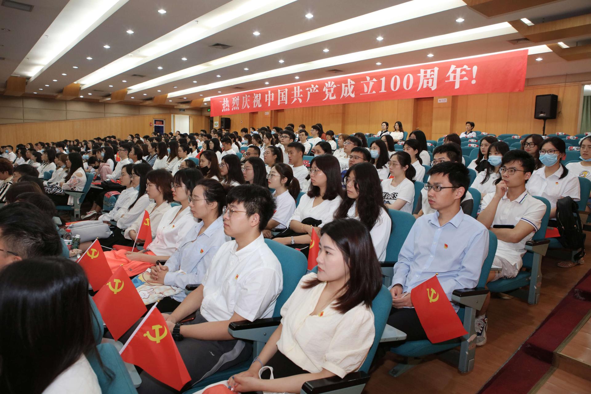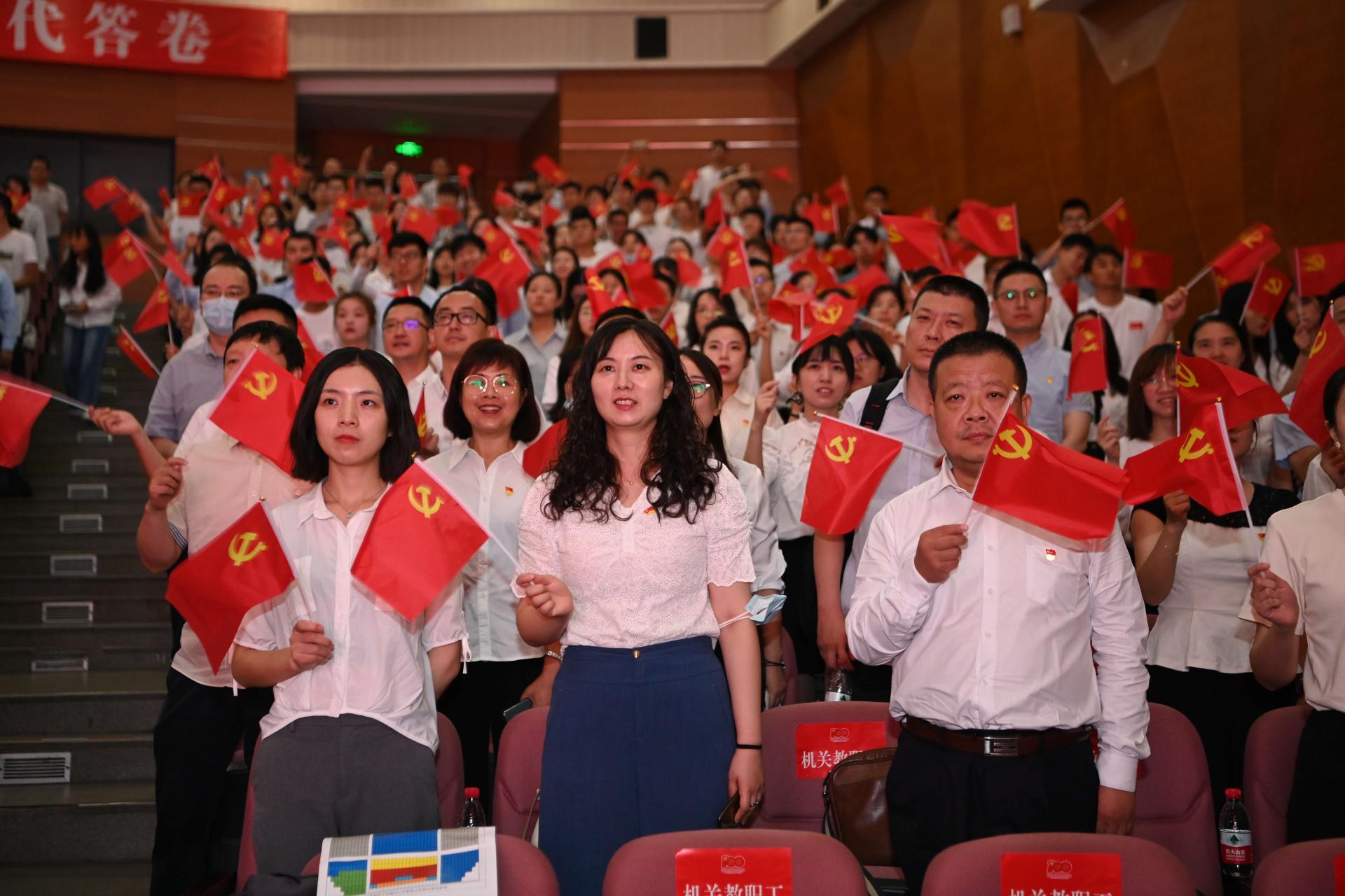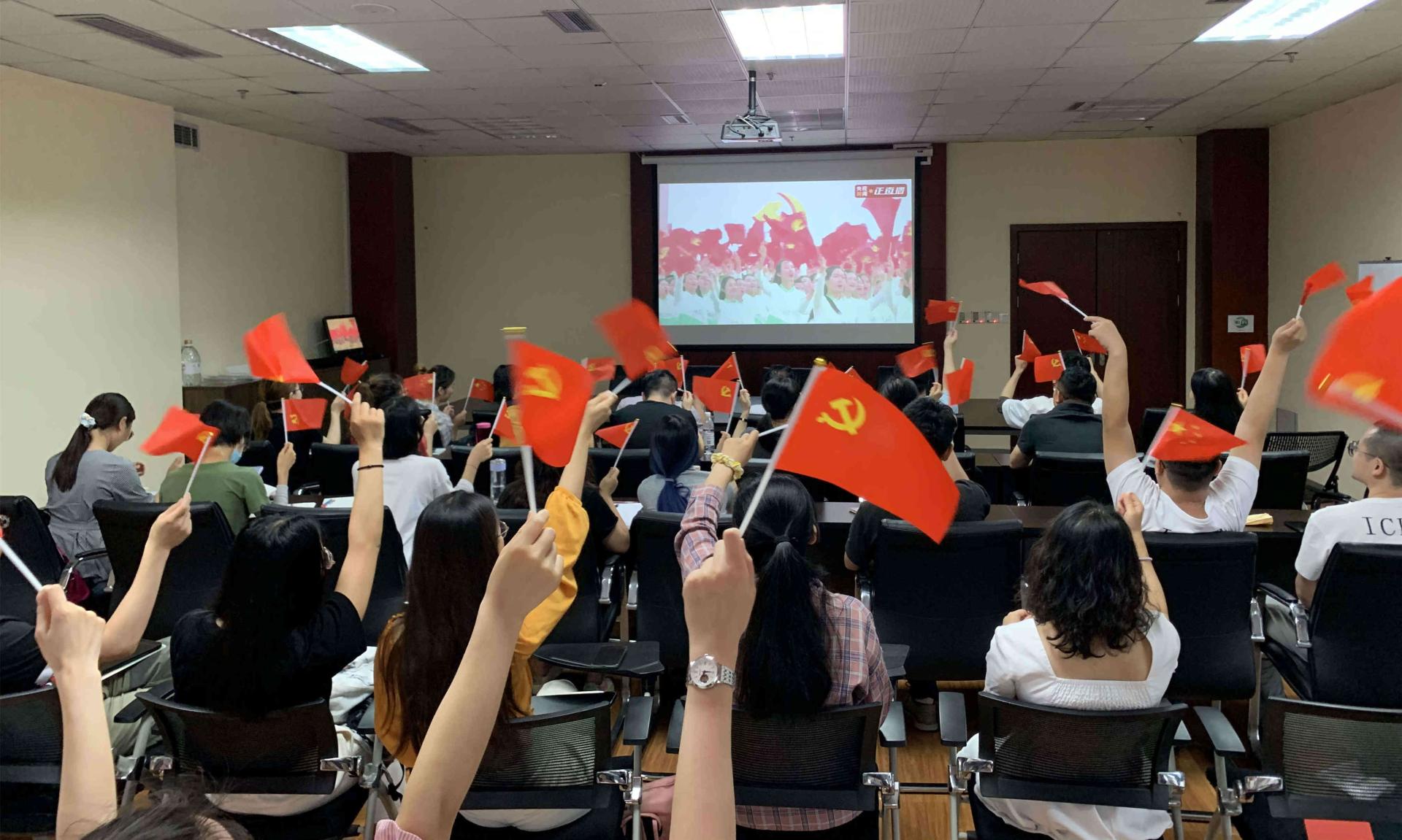 8點整,慶祝大會正式舉行。100響禮炮響徹云霄,71架戰鷹翱翔天際,五星紅旗在天安門廣場上冉冉升起,集中收看的西財師生全體肅立,跟隨電視直播一同高唱中華人民共和國國歌,愛黨愛國之情在這一刻升騰。在各個收看點,西財師生聚精會神聆聽習近平總書記的重要講話,在筆記本上認真記下習近平總書記重要講話精神,不時為習近平總書記的精彩講話而激動振奮,各個收看點多次響起熱烈的掌聲。當習近平總書記重要講話結束時,學校各個收看點現場響起長時間熱烈掌聲,師生們熱淚盈眶,手中的黨旗招展成一片紅色的海洋,大家發自內心地為我們黨的百年華誕自豪歡呼,共同慶祝中國共產黨百年華誕,共同祝愿祖國和世界的明天更加美好。