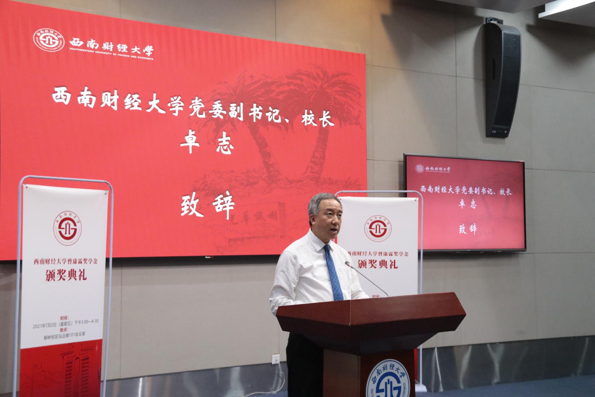 卓志發(fā)表致辭,代表學(xué)校向曾康霖教授致以誠(chéng)摯感謝和崇高敬意,向獲獎(jiǎng)同學(xué)表示衷心祝賀。他充分贊揚(yáng)了曾康霖教授在中國(guó)金融學(xué)科建設(shè)和我校金融學(xué)科建設(shè)中做出的卓越貢獻(xiàn),并對(duì)先生畢生為金融教育事業(yè)奉獻(xiàn)表達(dá)由衷敬意。他表示,曾康霖教授作為金融教育事業(yè)的耕耘者,言傳身教、誨人不倦,培養(yǎng)出大批國(guó)家棟梁之才,其學(xué)養(yǎng)、建樹(shù)和品格備受學(xué)界業(yè)界及廣大學(xué)生的敬仰。卓志希望獲獎(jiǎng)的同學(xué)愛(ài)黨愛(ài)國(guó),終身實(shí)干,在貢獻(xiàn)家國(guó)中成就大我,不馳于空想、不騖于虛聲,學(xué)習(xí)新知識(shí)、研究真學(xué)問(wèn)、解決真問(wèn)題,在融會(huì)貫通中創(chuàng)新突破。
