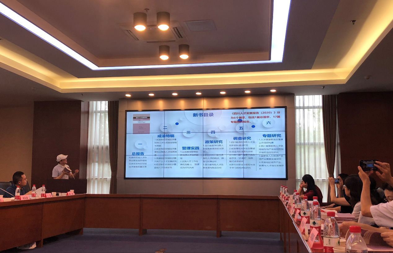 在接下來的成渝地區雙城經濟圈人才發展論壇中,王利民就圖書出版情況進行了介紹,發展研究院副院長陳濤教授主持發布了《四川人才發展報告(2020)》。該報告由發展研究院聯合CCG、政府、企業、高校、科研機構及社會智庫等十余位專家學者和一線管理者共同編寫完成,已經連續第四年發布。報告內容豐富、主題鮮明,分為總報告、成渝特稿、管理實踐、政策研究、調查研究和專題研究6個部分。