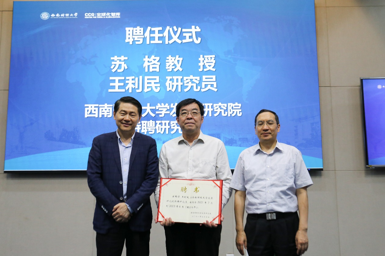 黨委常委、副校長史代敏教授與王輝耀為蘇格教授、王利民研究員頒發發展研究院特聘研究員聘書。