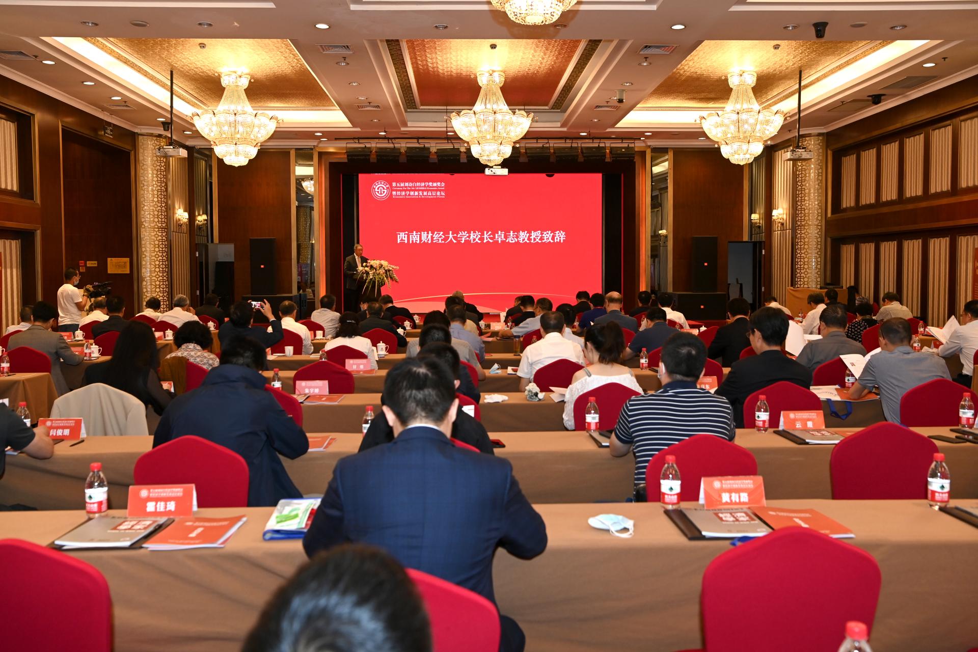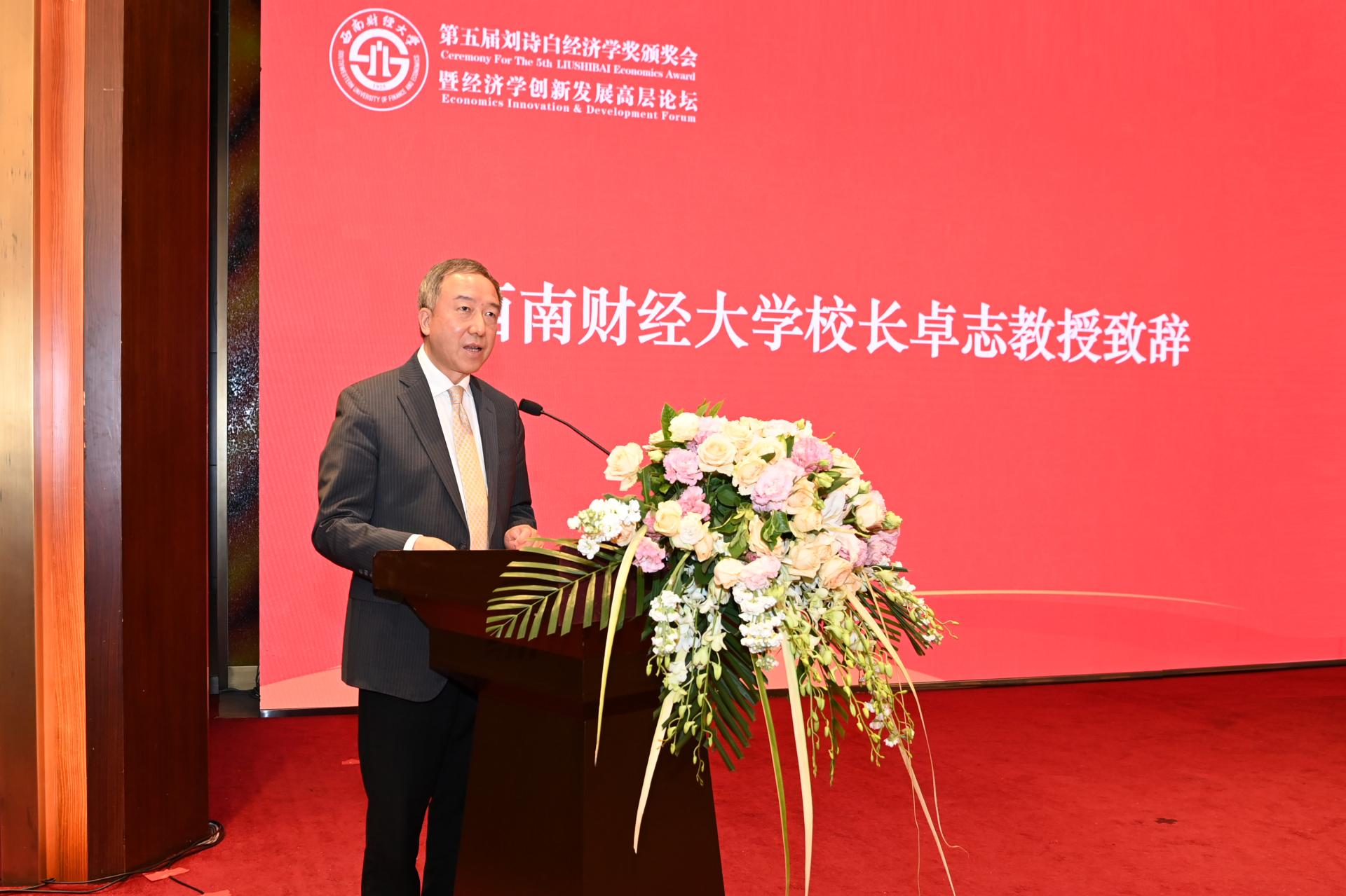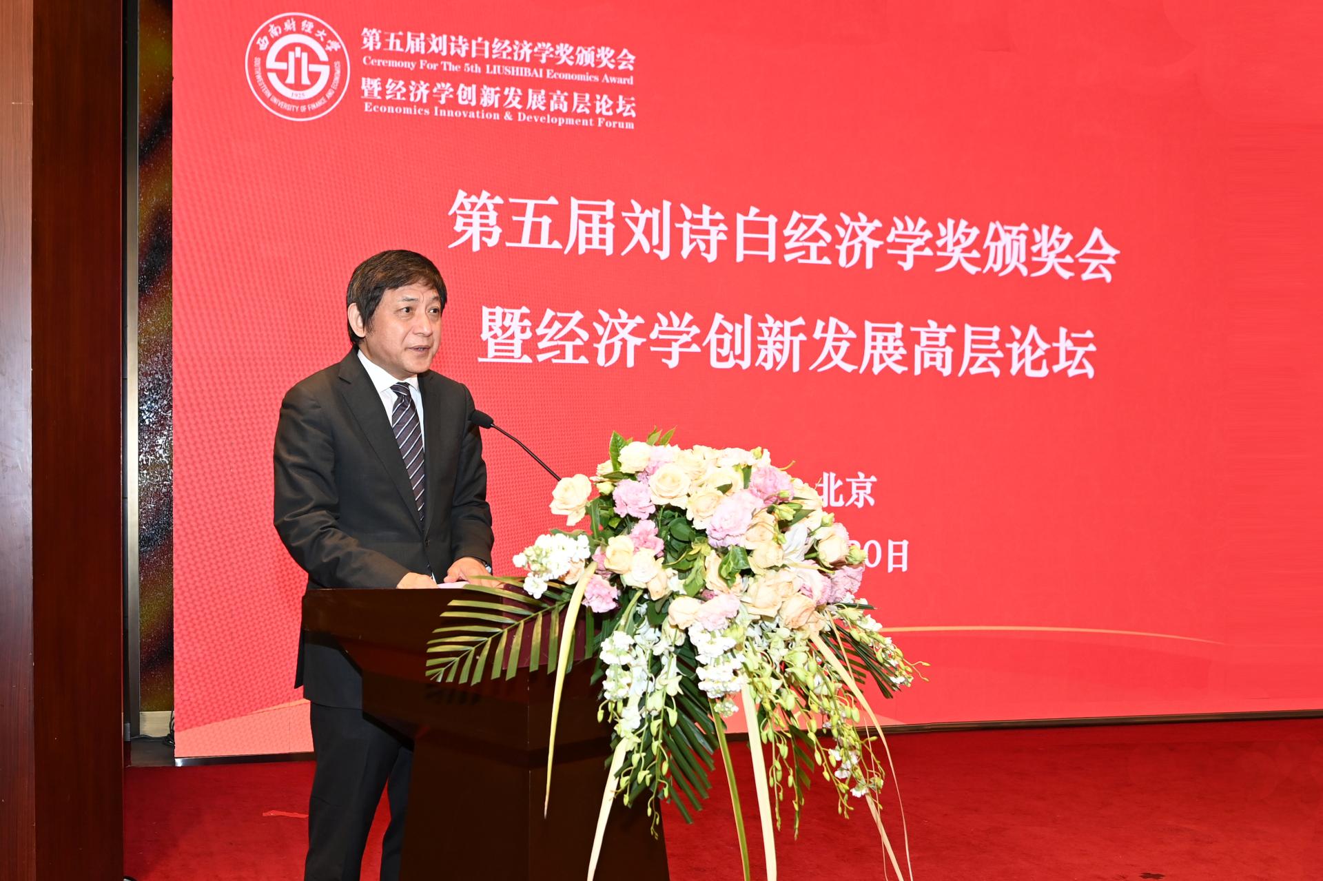 卓志致辭,代表學校對蒞臨會議的領導嘉賓、評獎委員會委員、校友表示熱烈歡迎,對他們長期以來的關心和支持表示衷心感謝,并向第五屆劉詩白經濟學獎獲獎者表示祝賀。他表示,西南財經大學設立劉詩白經濟學獎,就是為了傳承劉詩白教授等“大先生”在經濟學研究中的創新精神和治學態度,營造崇尚精品、嚴謹治學的學術氛圍,弘揚一種名師文化、一種大學精神,激勵和培養未來的學術大師。他指出,2012年起劉詩白經濟學獎已成功舉辦五屆,學術聲譽和學術影響力與日俱增,為構建中國經濟學特別是中國特色社會主義政治經濟學做出了積極探索。他表示,站在“十四五”開局起步、“雙一流”二期建設和迎接“百年西財”新的歷史起點上,西南財經大學將深刻把握“現代化”“高質量”“新財經”“雙一流”的戰略考量和創新、人才、數字、改革、開放、文化的戰略任務,推動學校在服務新發展格局中展現更大作為。他表示,“十四五”時期,西南財經大學將以習近平新時代中國特色社會主義思想為指導,深入貫徹習近平總書記關于哲學社會科學工作的重要論述,聚焦聚力加快構建中國特色哲學社會科學,持續加強習近平新時代中國特色社會主義思想特別是經濟思想的研究闡釋,著力構建中國特色社會主義政治經濟學、現代金融學和工商管理三大理論體系,努力講清“中國奇跡”背后的道理、學理、哲理,講好中國高等教育故事,在加快構建中國特色經濟學與管理學、打造中國特色高等教育話語體系中持續貢獻西財力量。