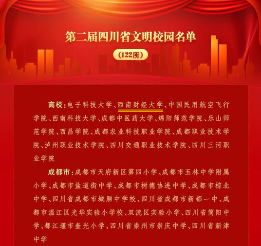 12月28日,在四川省精神文明建設表彰大會上傳來喜訊,西南財經大學獲評第二屆四川省文明校園。