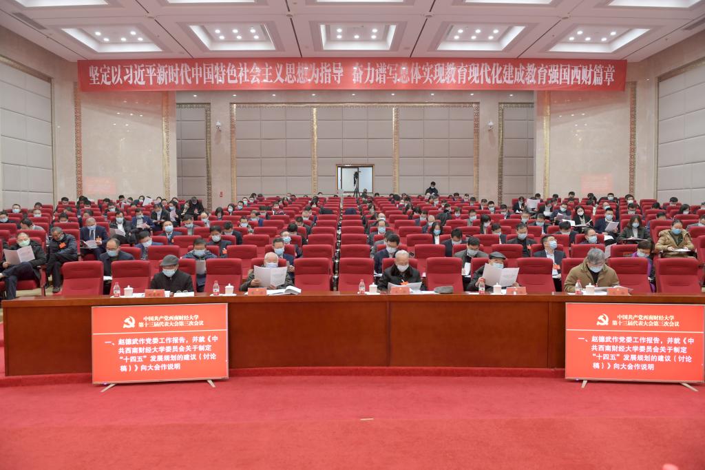 大會通過了趙德武同志代表學校黨委所作的工作報告,審議通過了《中共西南財經大學委員會關于制定“十四五”發展規劃的建議(討論稿)》《中國共產黨西南財經大學第十三屆代表大會第三次會議決議(草案)》。