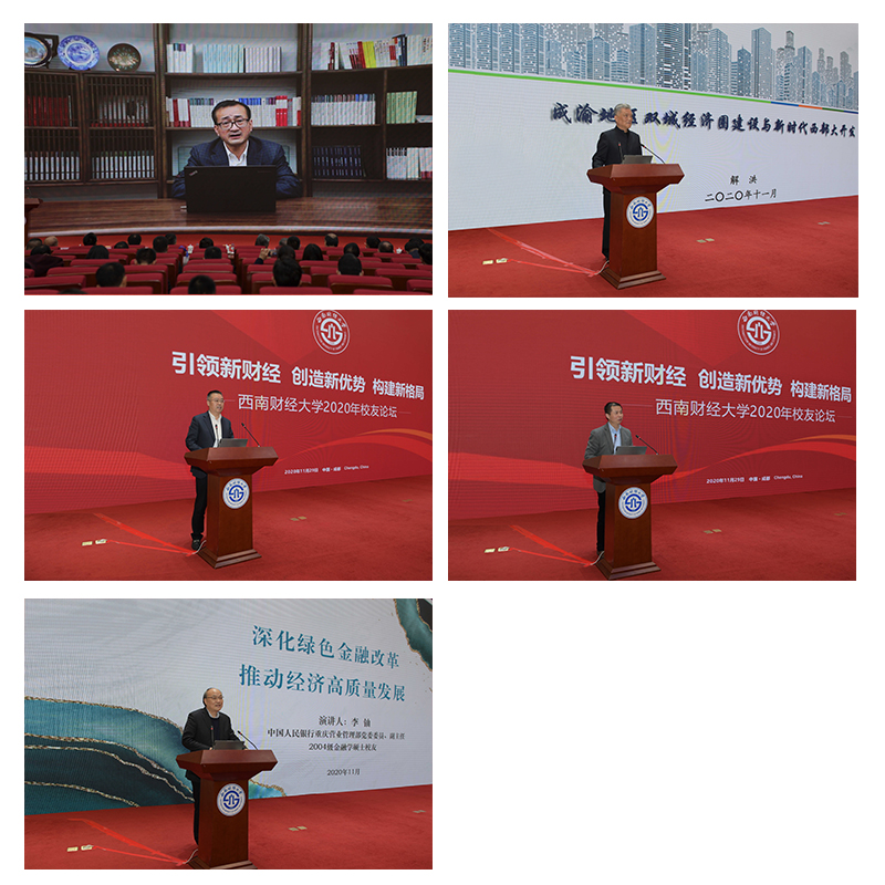 校友論壇中,中國人民大學副校長劉元春,四川省政協原副主席解洪,成都市地方金融監管局黨組書記、局長梁其洲,中國人民銀行成都分行黨委委員、副行長方昕,中國人民銀行重慶營業管理部黨委委員、副主任李鈾分別圍繞“‘十四五’規劃和2035遠景目標的測算解讀”“成渝地區雙城經濟圈建設與新時代西部大開發”“建設西部金融中心的探索與實踐”“數字經濟時代的新課題:通貨膨脹、數據產權與數字貨幣”“深化綠色金融改革,推動經濟高質量發展”等主題發表主旨演講。尹慶雙主持演講。