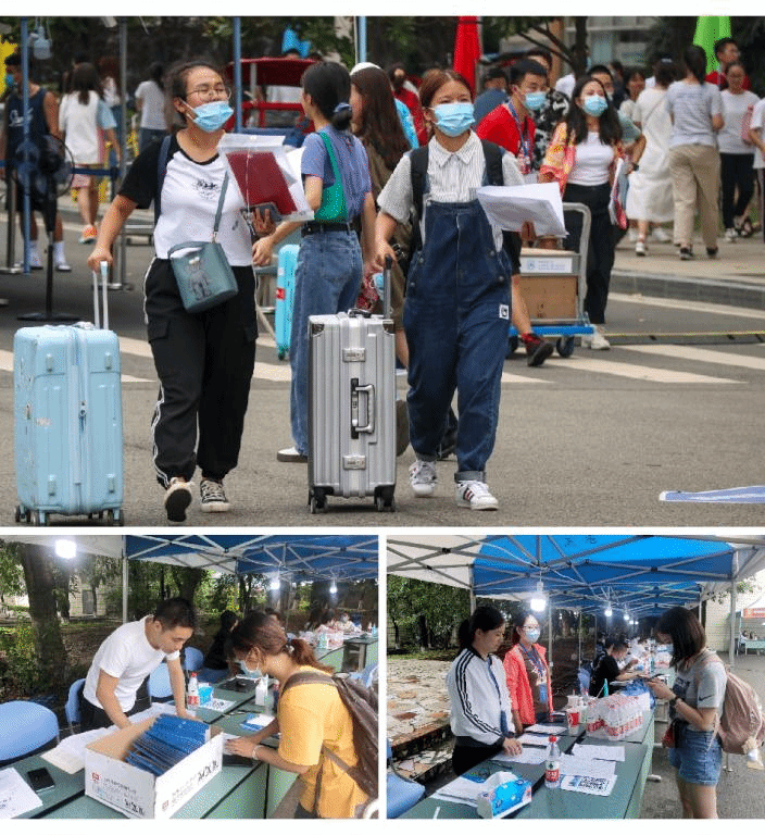 暑熱未褪,防疫工作人員身著隔離服一絲不茍地為每一位同學(xué)檢測(cè)體溫、消毒行李、更換口罩,細(xì)心保障著大家的生命安全與身體健康;
