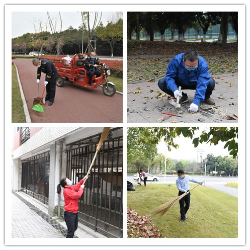 上午九點半,黨委書記趙德武,校長、黨委副書記卓志分別帶領校領導班子成員、中層干部和師生代表,戴好口罩,戴上手套,拿起工具,對兩校區公共區域實行分組包干大掃除。清潔地面、清理落葉、清除淤泥、清掃垃圾,20個工作組分片、分散勞動,合力打掃校園主干道、綠化帶、校內水域、學生宿舍、停車場等室外區域,細致消毒宿舍、食堂、辦公室、廁所等室內場所,作業區域覆蓋教職工辦公室、留校學生公寓、職工宿舍、食堂、廣場、廁所、地下排水溝渠等,維護校內環境衛生、干凈、整潔,校園里隨處可見埋頭苦干、揮汗如雨的賣力身影。