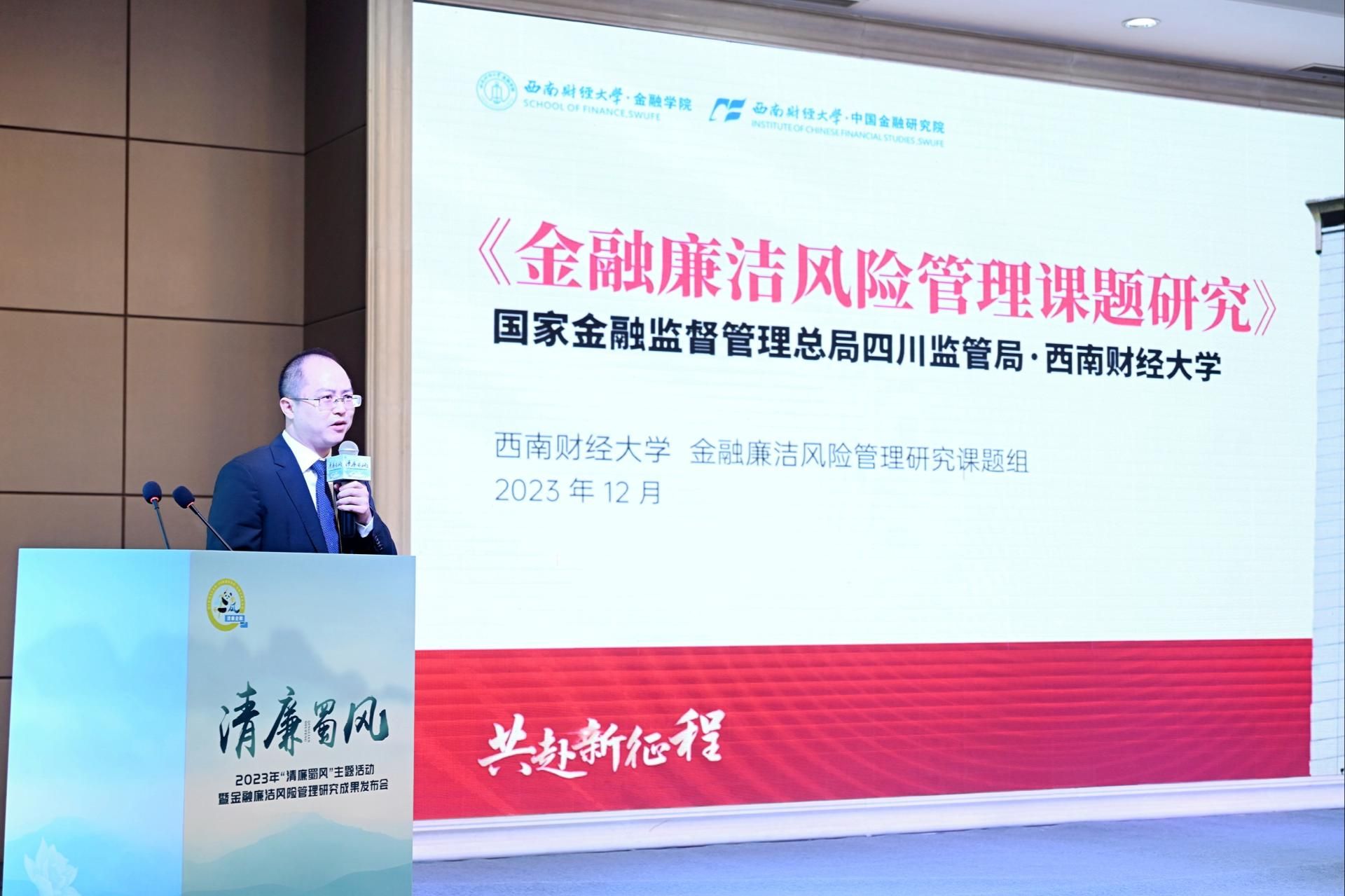 為深入貫徹落實(shí)中央金融工作會(huì)議、中央經(jīng)濟(jì)工作會(huì)議精神,持續(xù)推動(dòng)四川清廉金融文化建設(shè)走深走實(shí),涵養(yǎng)四川金融系統(tǒng)風(fēng)清氣正政治生態(tài),12月14日,國家金融監(jiān)督管理總局四川監(jiān)管局和我校共同舉辦2023年“清廉蜀風(fēng)”主題活動(dòng)暨金融廉潔風(fēng)險(xiǎn)管理研究成果發(fā)布會(huì)。國家金融監(jiān)督管理總局四川監(jiān)管局黨委書記、局長(zhǎng)陳育林,學(xué)校原校長(zhǎng)、西財(cái)清廉金融教育基地負(fù)責(zé)人卓志,學(xué)校黨委副書記、校長(zhǎng)李永強(qiáng)出席活動(dòng)。國家金融監(jiān)督管理總局有關(guān)部門、四川省紀(jì)委監(jiān)委及四川省各金融管理部門負(fù)責(zé)人、有關(guān)專家學(xué)者、在川各銀行保險(xiǎn)機(jī)構(gòu)主要負(fù)責(zé)人共280余人參加活動(dòng)。