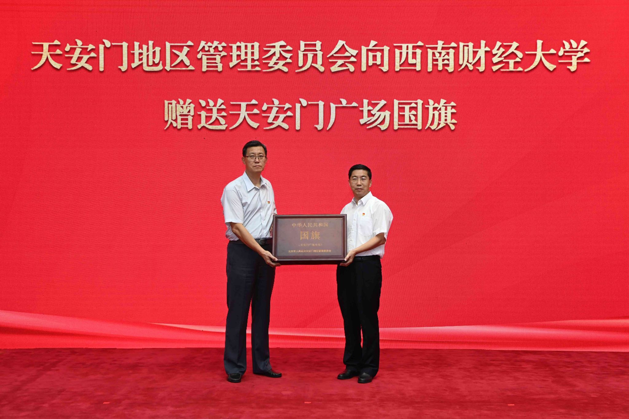 在天安門廣場升掛過的國旗具有唯一性,十分珍貴。這面編號為2024-0155的國旗于2024年6月3日在天安門廣場升起,正值西南財經(jīng)大學(xué)建校99周年,對于學(xué)校意義非凡。天安門地區(qū)管理委員會將這面國旗贈予學(xué)校,是對學(xué)校即將迎來百年華誕的衷心祝賀、對學(xué)校近百年輝煌成就的贊譽肯定,更是對學(xué)校事業(yè)發(fā)展的巨大鼓舞和極大鞭策。