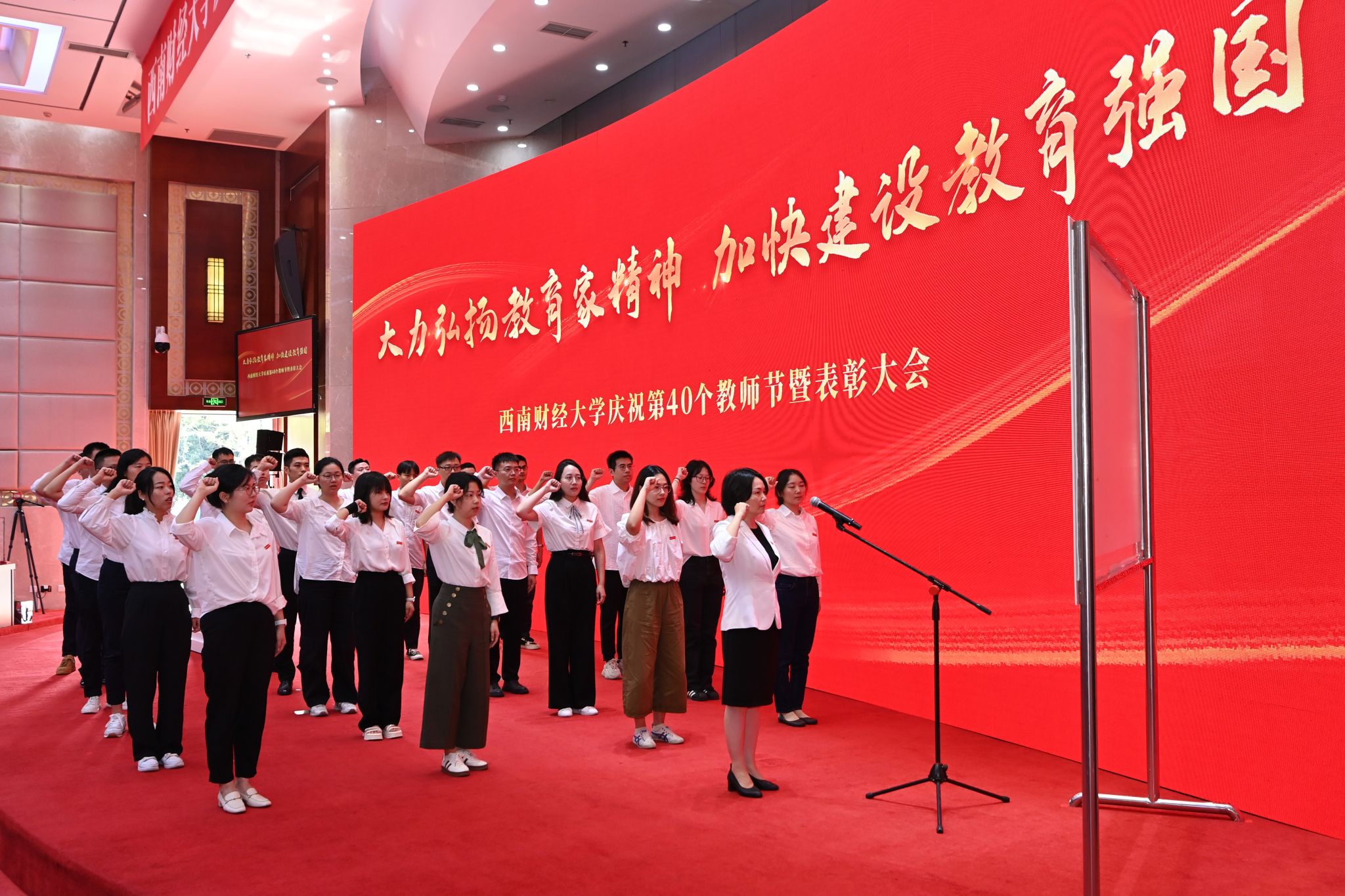 隨后,新進(jìn)教職工代表面對(duì)校旗莊嚴(yán)宣誓,將忠于教育事業(yè),履行教師職責(zé),弘揚(yáng)財(cái)經(jīng)文明,培育華夏棟梁,為實(shí)現(xiàn)中華民族偉大復(fù)興而奮斗。
