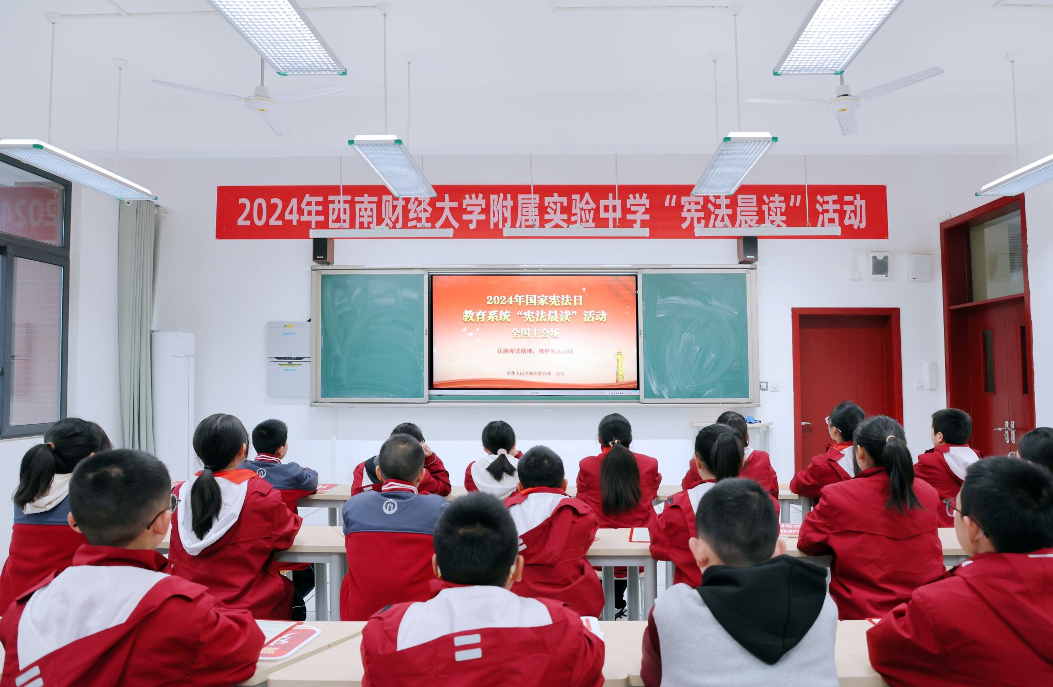 12月4日是第十一個(gè)國(guó)家憲法日。為深入學(xué)習(xí)踐行習(xí)近平法治思想,認(rèn)真貫徹黨的二十大和二十屆二中、三中全會(huì)以及全國(guó)教育大會(huì)精神,加強(qiáng)憲法法治教育,12月4日上午,國(guó)家憲法日教育系統(tǒng)“憲法晨讀”活動(dòng)舉行。教育部在北京設(shè)主會(huì)場(chǎng)。學(xué)校在柳林校區(qū)劉詩(shī)白書院“一站式”學(xué)生社區(qū)和西南財(cái)經(jīng)大學(xué)附屬實(shí)驗(yàn)中學(xué)設(shè)分會(huì)場(chǎng)。