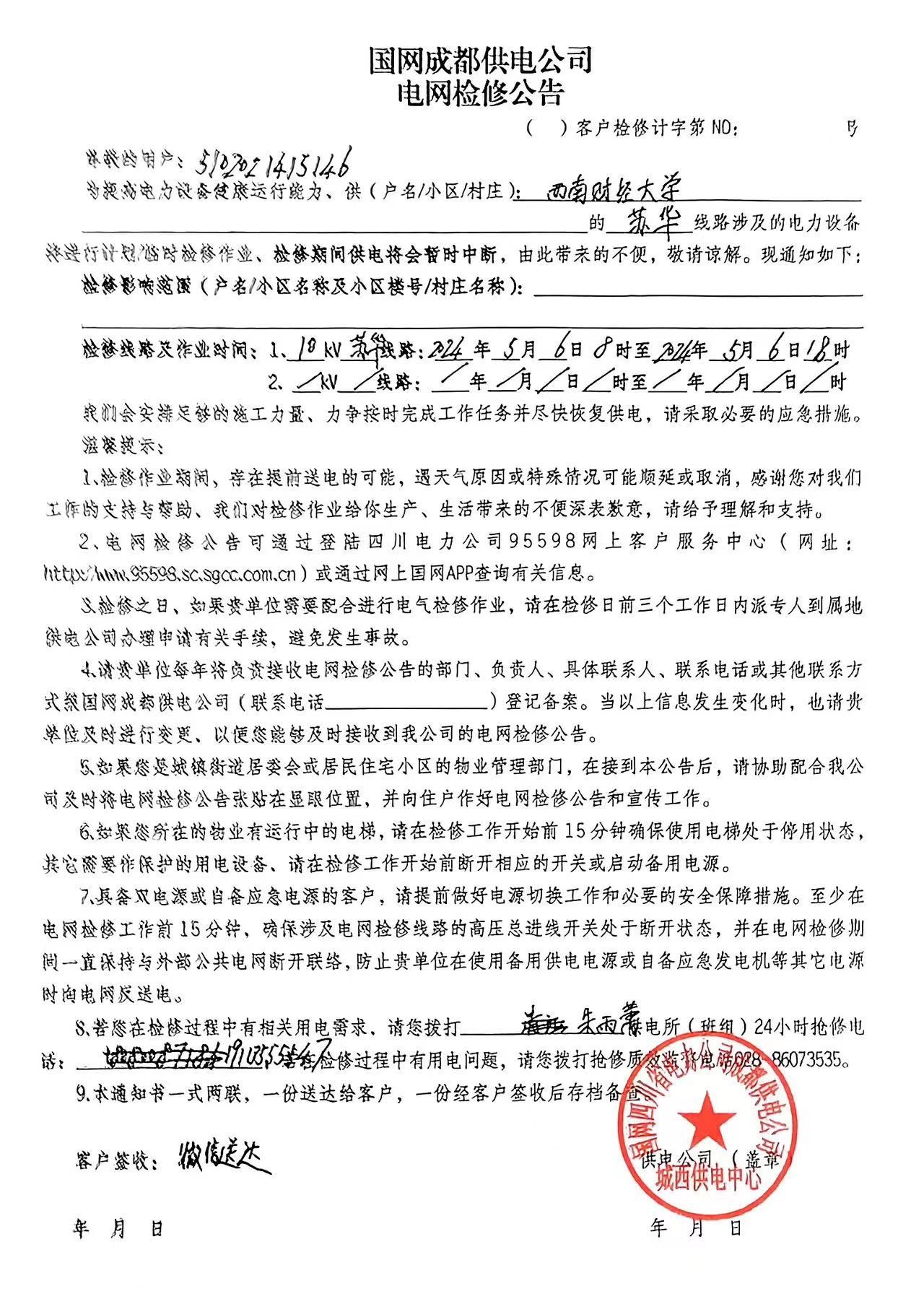 特別提示:停電期間,電梯和空調停止運行。由此給您帶來的不便,敬請諒解。