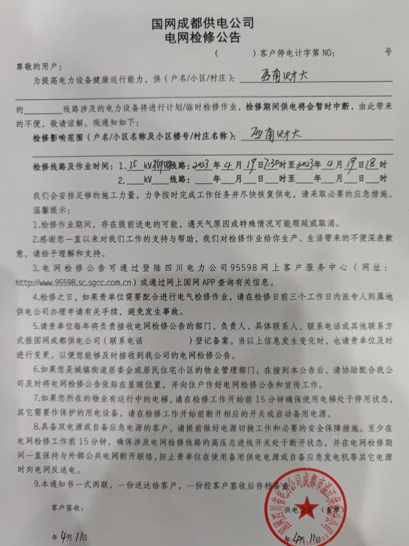 請各用戶作好停電準(zhǔn)備并關(guān)好用電器開關(guān)。